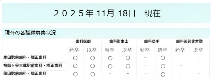 川崎市多摩区の生田駅前歯科・矯正歯科、世田谷区の祖師ヶ谷大蔵駅前歯科・矯正歯科、大田区の蒲田駅前歯科・矯正歯科を運営している医療法人になります。私たちは共に働いてくれるスタッフを募集しています。歯科医師・歯科衛生士・歯科技工士・歯科助手・受付・管理栄養士・コーディネーターがそれぞれ高品質な医療を提供できるように日々研鑽しています。私たちは共に働く仲間のキャリアアップを応援しています。そのため、研修費は基本全額医院負担、社会保険も完備、最新設備を導入した充実の環境を整えてお待ちしております。