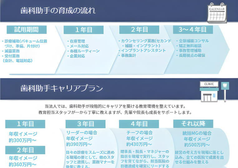当法人の「⻭科助手」は、治療のアシスタントというだけの存在ではありません。もちろんアシスタントや受付業務も大切なお仕事ですが、なによりも歯科医院の中で最も患者さまに寄り添う存在であることが、歯科助手の重要な役割だと思っています。 当法人における歯科助手の方のポジションは、医院全体のマネジメントにも関わることができますので、とてもやりがいがある仕事です。