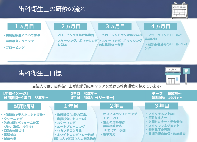 | 仕事内容 | 歯周病治療、予防処置、TBI、ホワイトニング、インプラント手術アシスト、診療補助など | ||